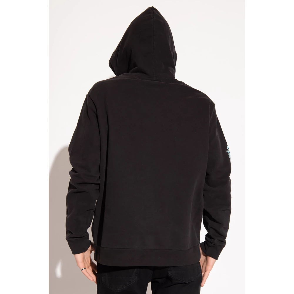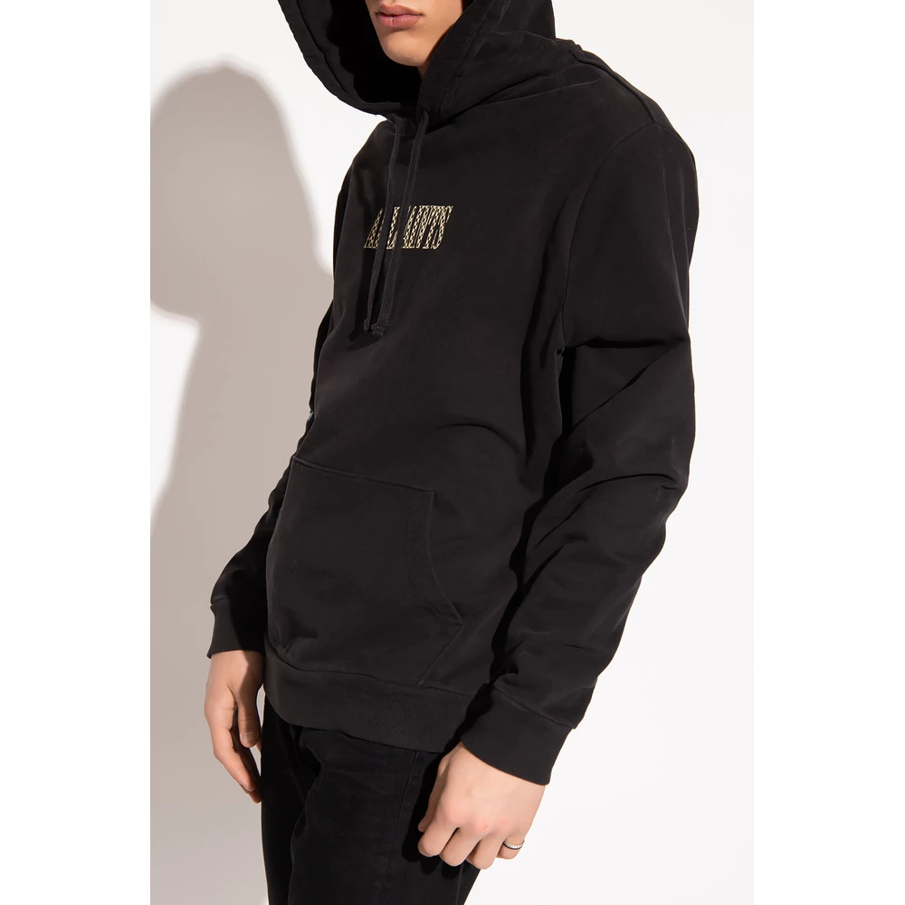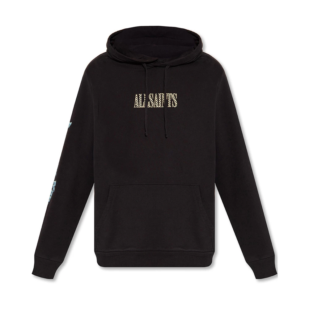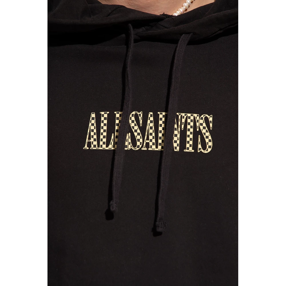 Svart ‘sjekk’ hettegenser fra AllSaints. Dette plagget er laget av bomull, og har en trekkstringhet, flerfarget logotrykk, frontlomme og ribbestrikkede trimmer ved hemmen og mansjettene.