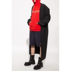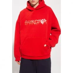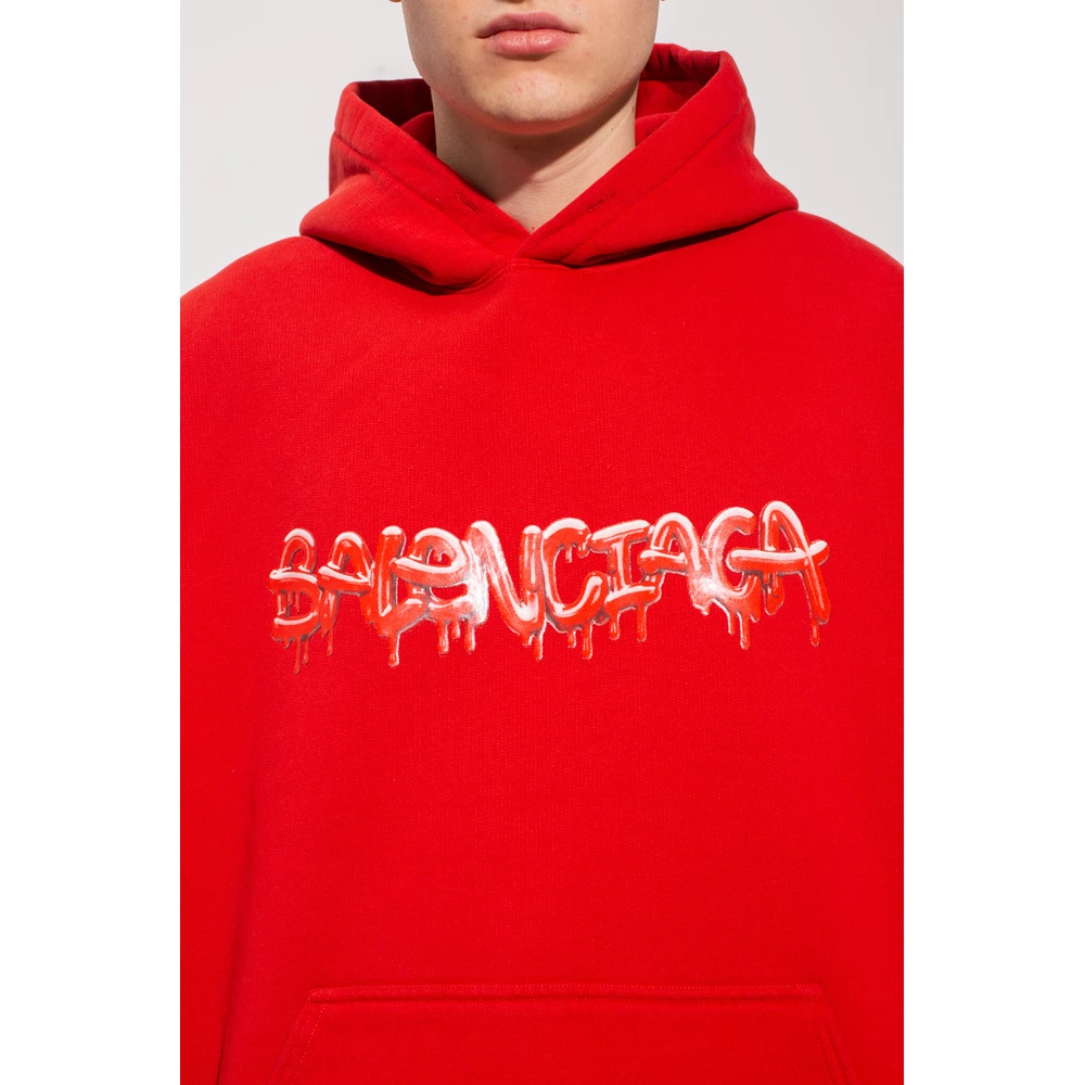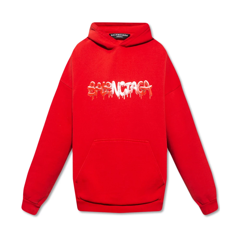 Rød hettegenser fra Balenciaga. Denne stilen er laget av bomullsjersey og viser et hvitt, grått og rødt grafisk trykk med merkets logo, en kengurulomme og ribbestrikkede kanter nederst og på mansjettene. Materiale: 80 % bomull, 20 % polyester Produktstil-ID: 674986TLVF2-6407 Denne beskrivelsen har blitt oversatt automatisk.