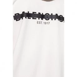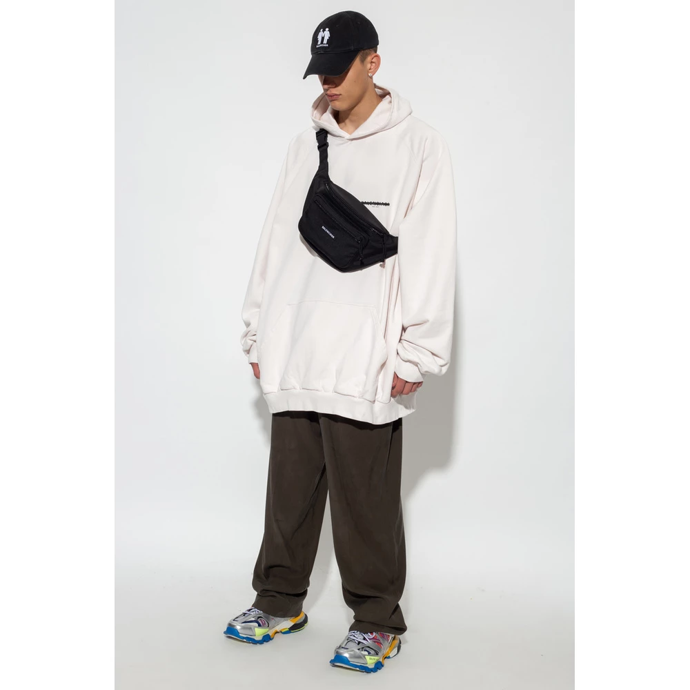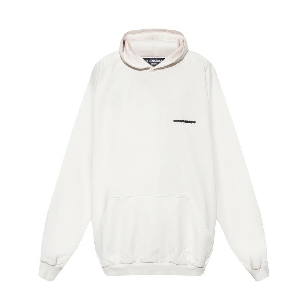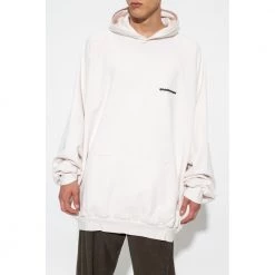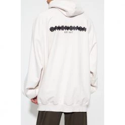 Lys rosa krem ââhettegenser fra Balenciaga. Dette plagget er laget av bomull, og har et svart logo -mĂžnster, glidelomme og ribbet trims ved hemmen og mansjettene.
