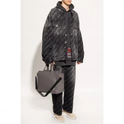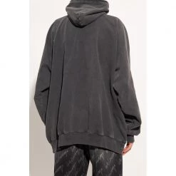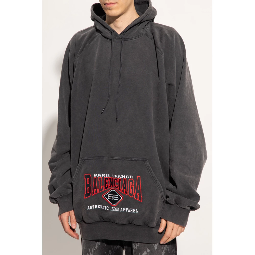 MÞrkegrÄ sweatshirt med en trekningsjusterbar hette fra Balenciaga. Denne stilen er laget av bomull med en overdimensjonert silhuett, og har en kengurulomme brodert med en rÞd, hvit og svart logo, og elastisk trimmer pÄ bunnen og mansjettene.