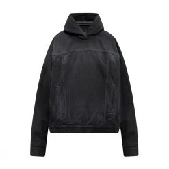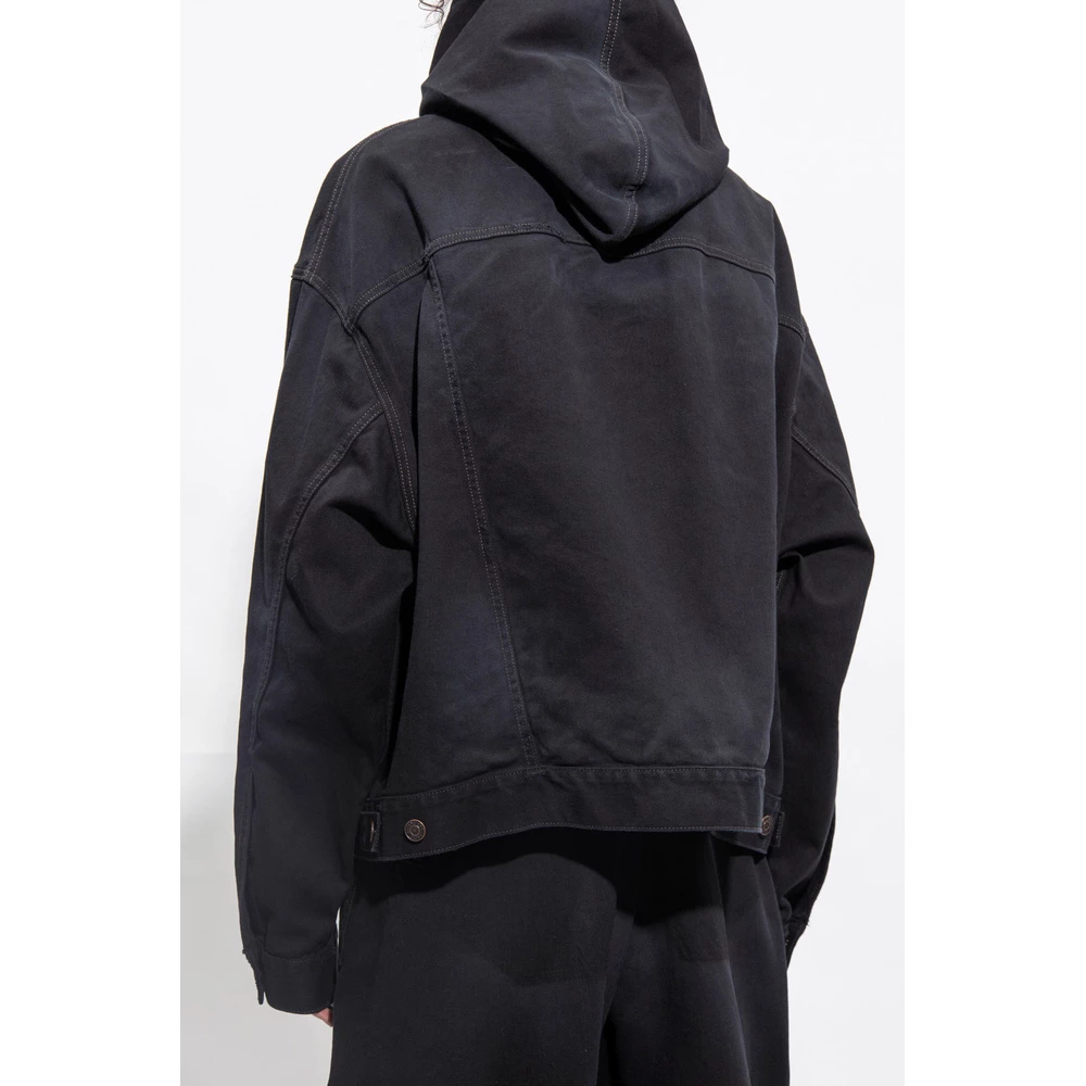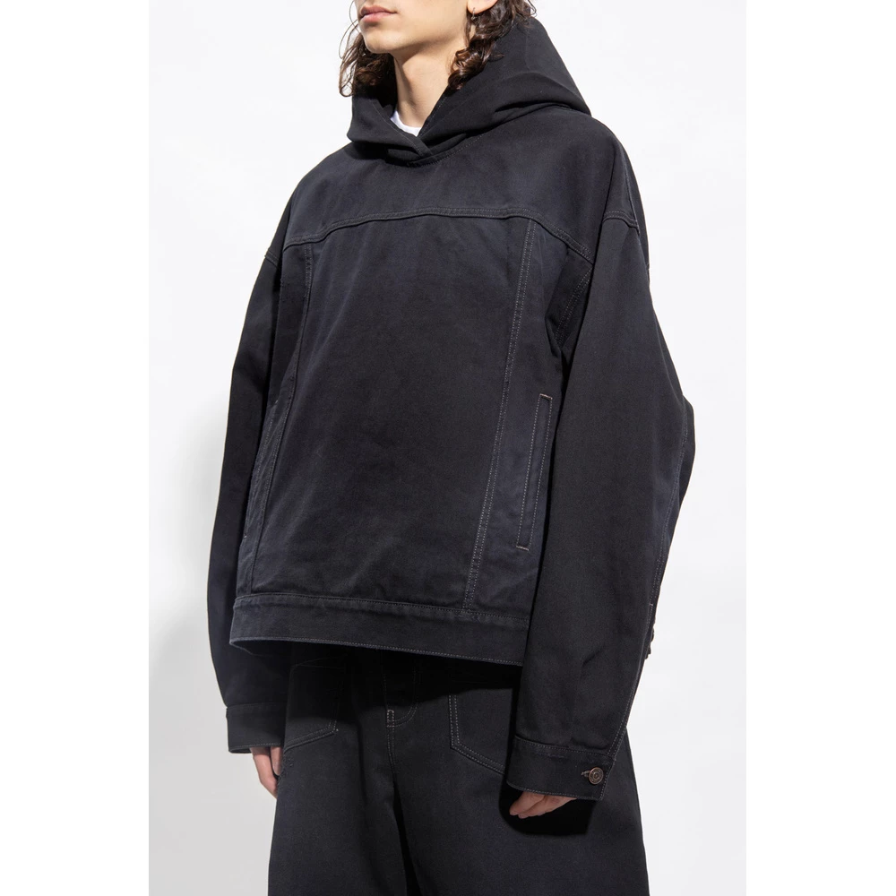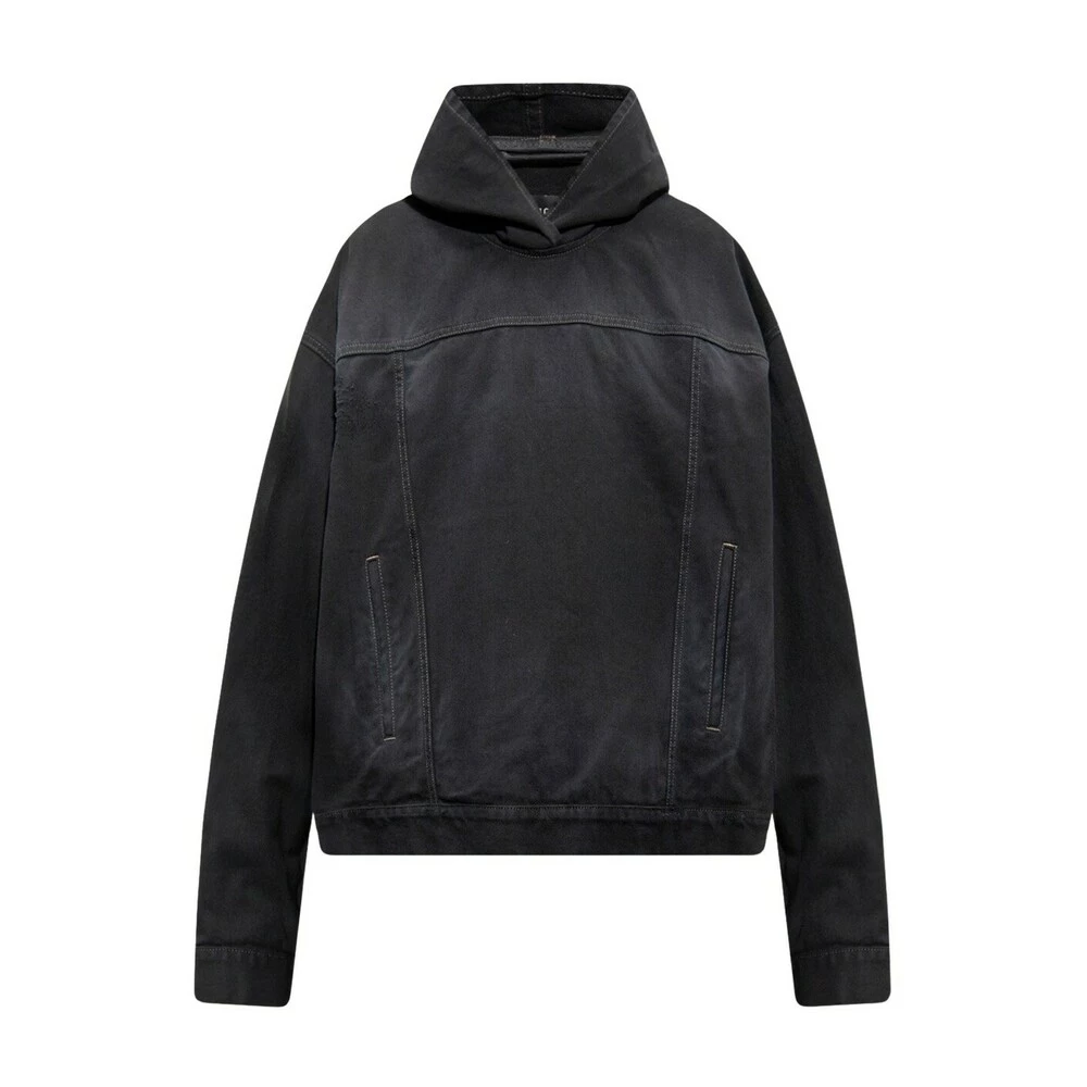 Svart Distressed Denim Hoodie fra Balenciaga. Denne store designen har to glidelommer og lange ermer med mansjetter med knapper.