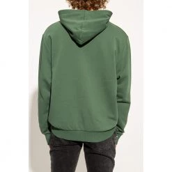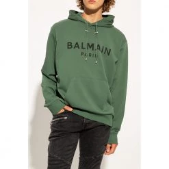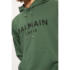 MĂžrkegrĂžnn hettegenser fra Balmain. Dette plagget er laget av bomull, og har en svart logotrykk, trekkstringhette, lommen foran og ribbestrikk ved hemmen og mansjettene.