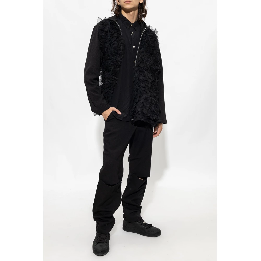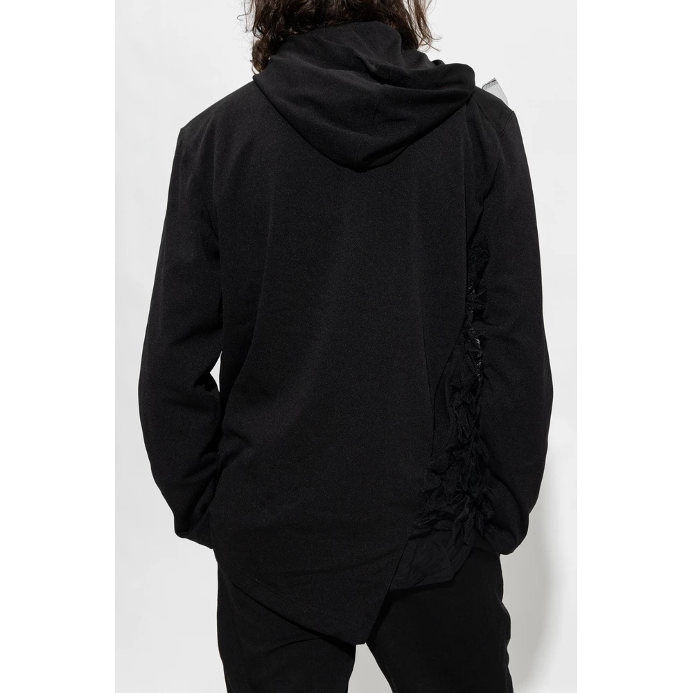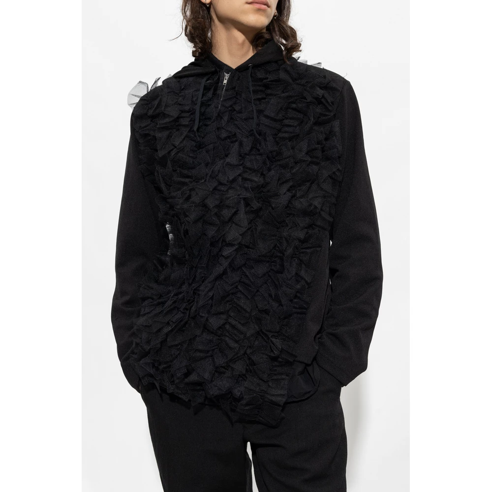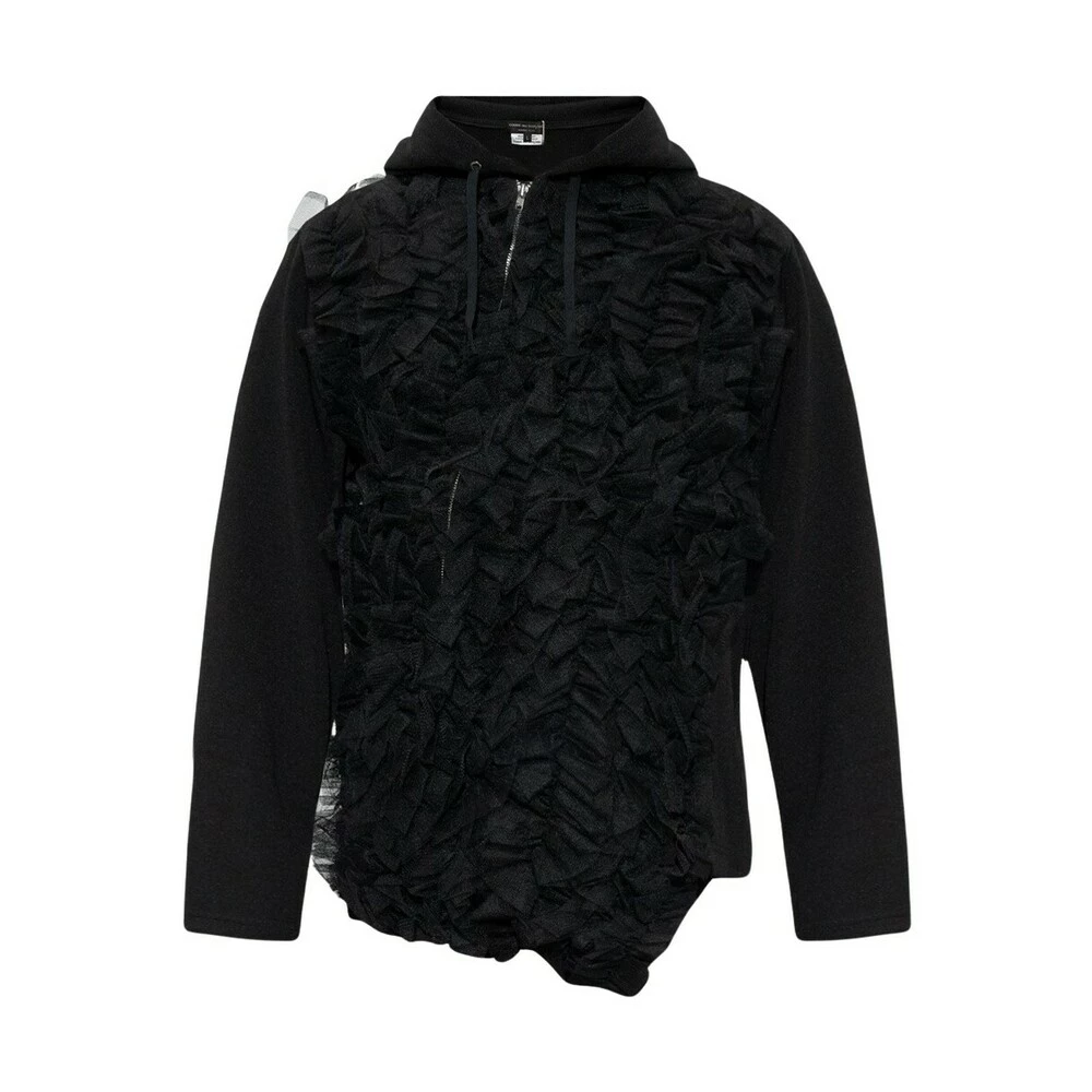 Svart sweatshirt med en trekningsjusterbar hette fra Comme des Garcons Homme Plus. Denne stilen er utmerket med tyll ruffles, og har en glidelÄsfesting, to frontallommer, lange ermer og en asymmetrisk hem.