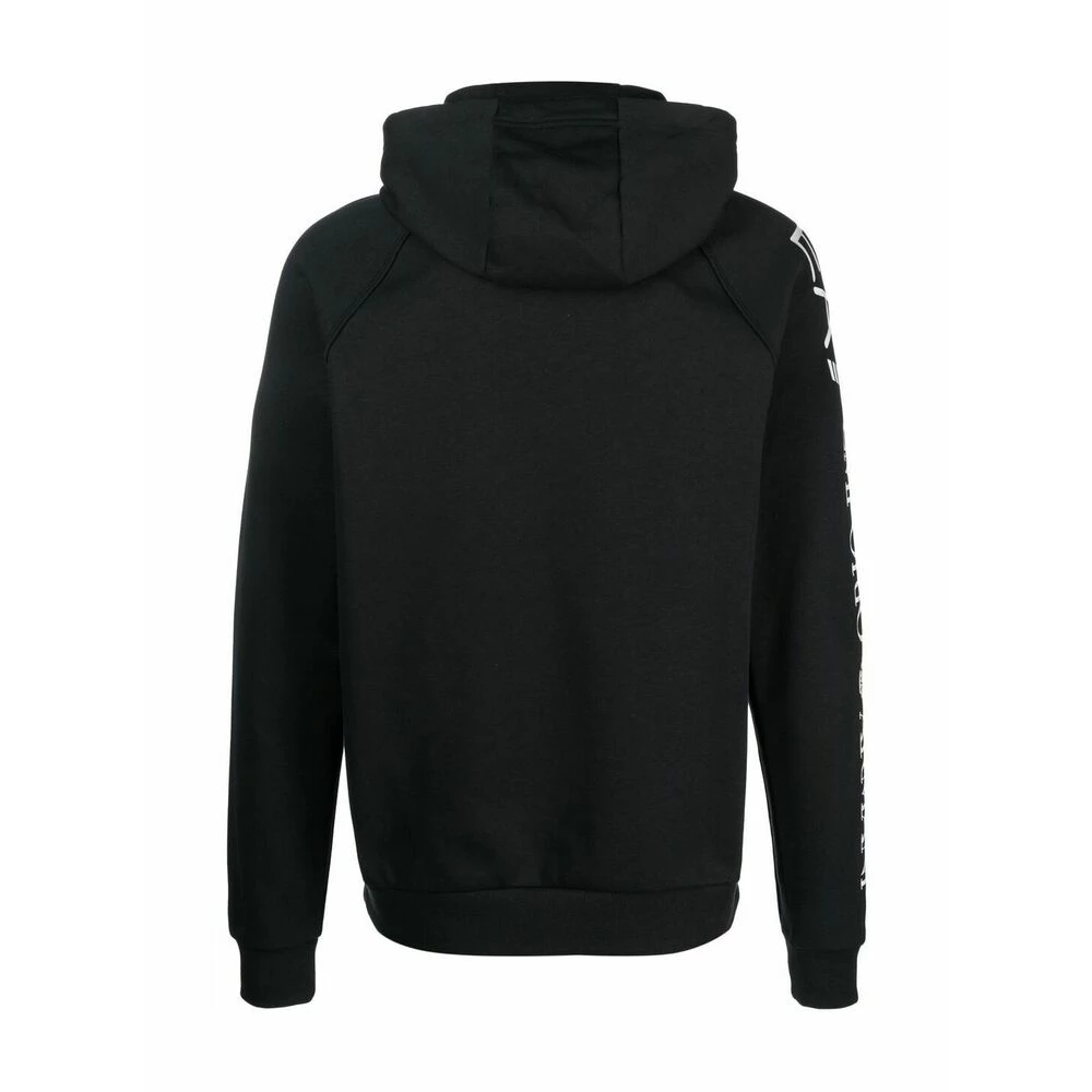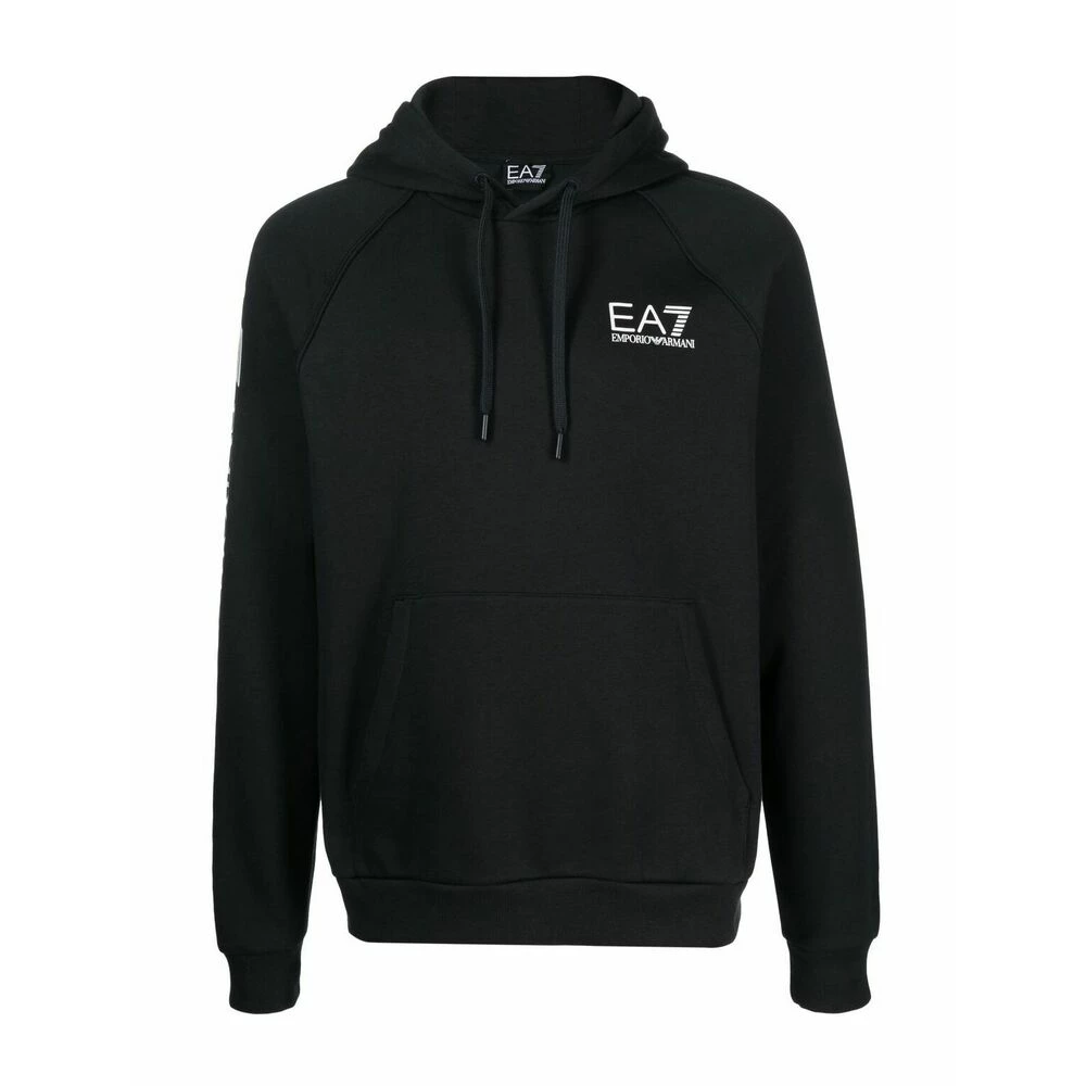 Ea7 gensere blÄ logo-trykk bomull hettegenser fra ea7 emporio armani med midnattblÄ, bomullsblanding, logo-trykk pÄ ermet, logo-trykk ved brystet, snor hette, frontpose, lange raglan ermer og ribbet hem.