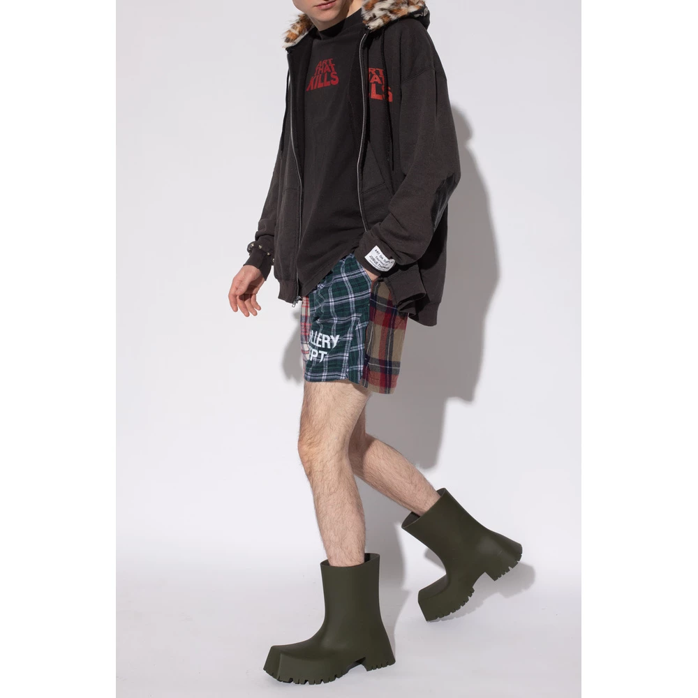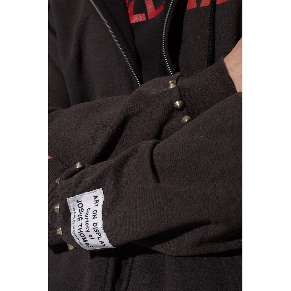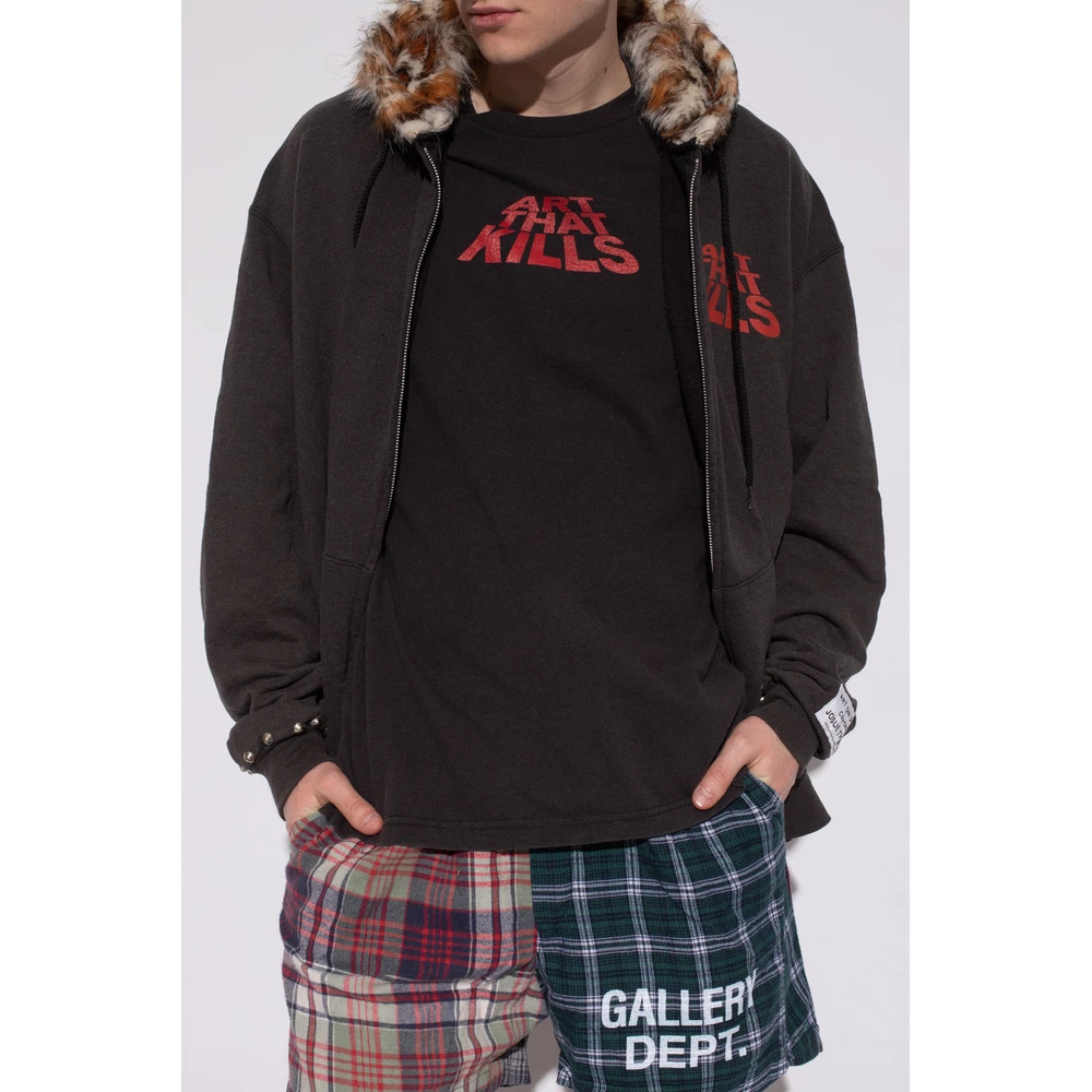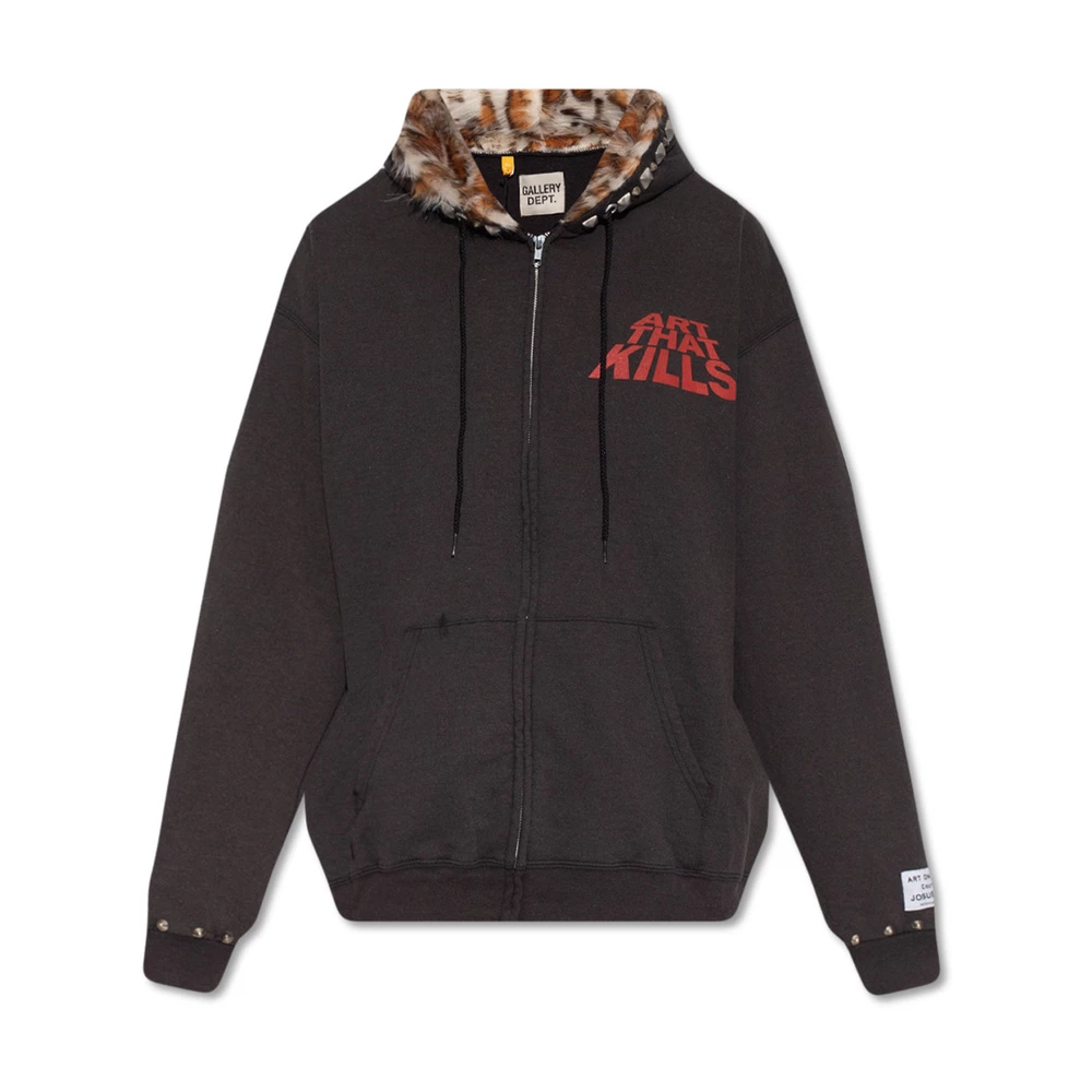 MÞrkegrÄ sweatshirt med en skyggelagt effekt fra Gallery Dept. Denne lange ermetdesignet er laget av bomull og har en glidelÄs -festing, trekkstringhette med fuskepelsfÎr i hvitt, brunt og svart, rÞdt trykk, to glidelommer, svarte lapper pÄ ermene, dekorative pigger og ribbestrikkede trimmer i hem og mansjetter.