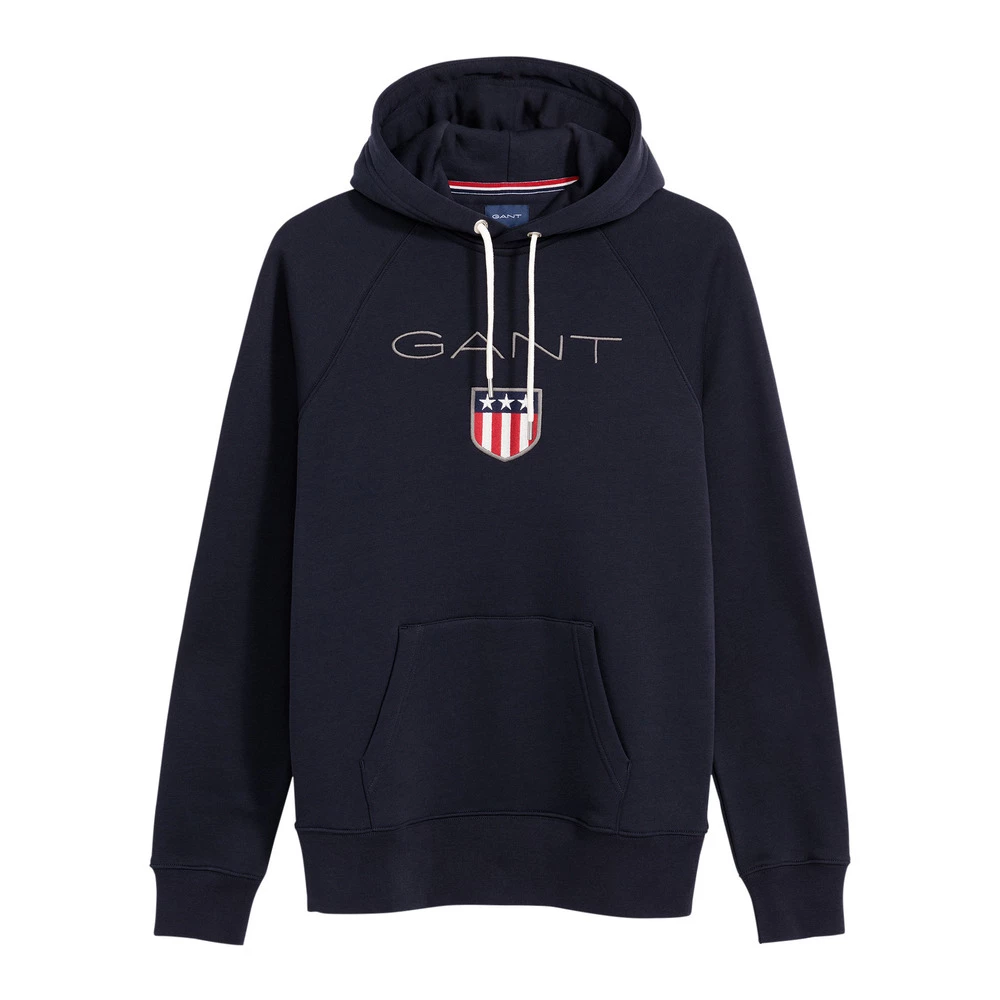 Shield Hoodie fra Gant. Deilig hettegenser med rund hals og stropper. Logo pÄ brystet og normal fit. Perfekt genser Ä reise i eller brukte til hverdags. Normal i stÞrrelsen. Materiale: 87 % Bomull, 13 % Polyester