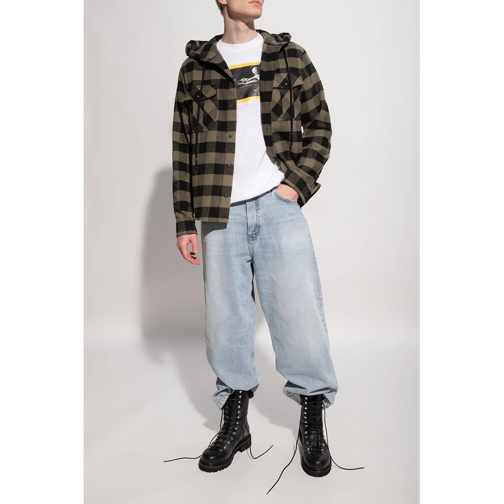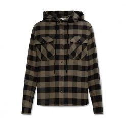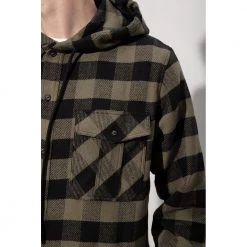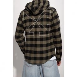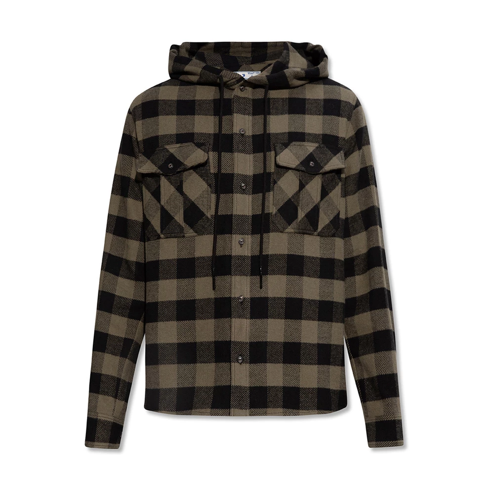GrĂžnn og svart skjorte med en tegnerjusterbar hette fra off-white. Denne stilen er pyntet med et all-over-sjekkmĂžnster, og har knappfester, to flappede lommer og lange ermer med knappmansjetter.