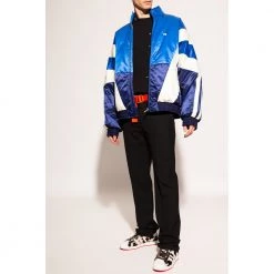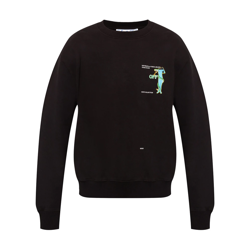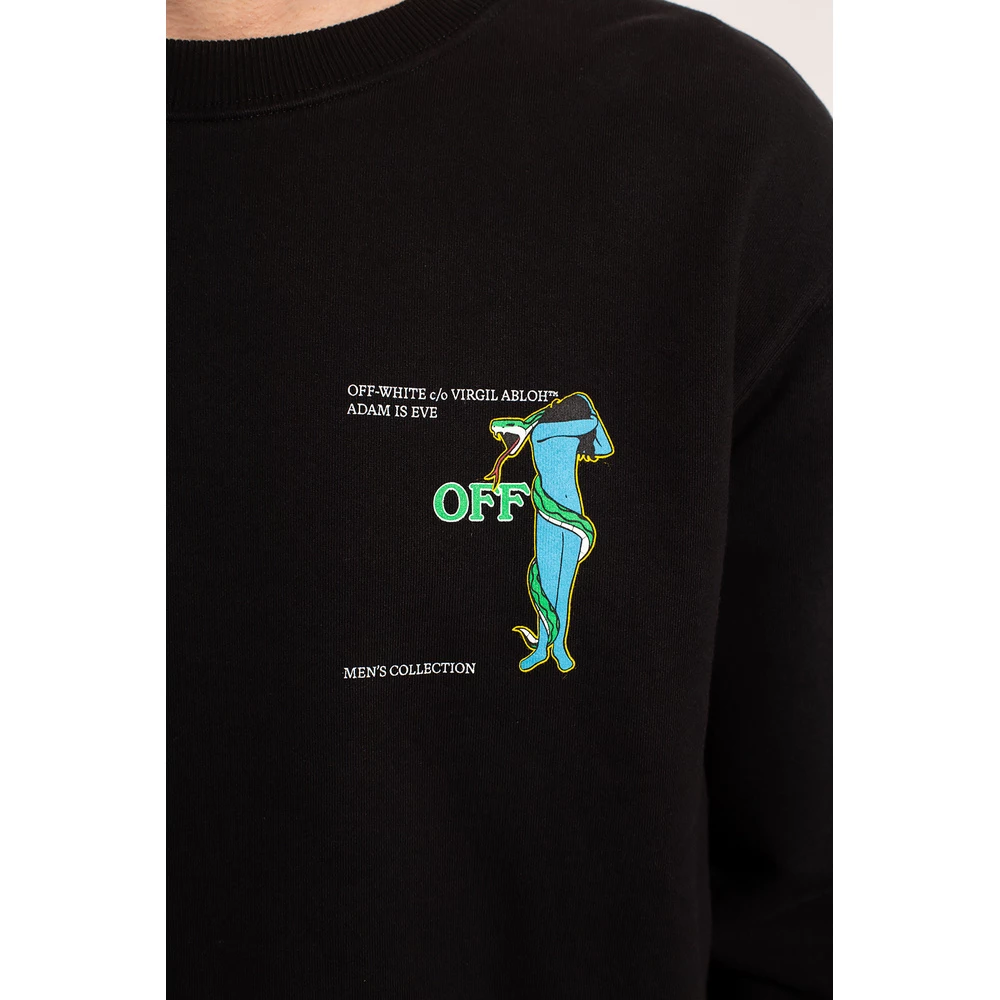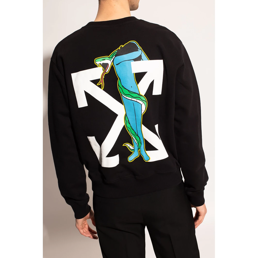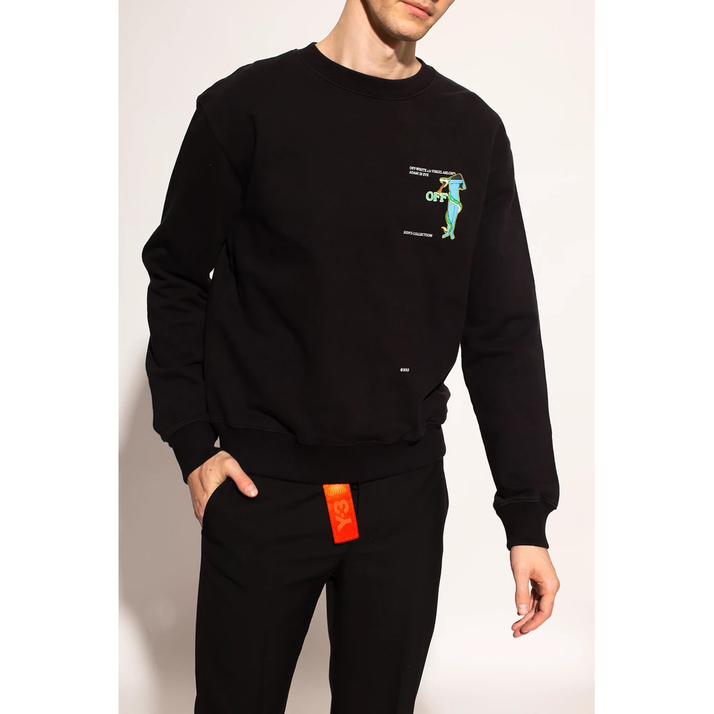 Svart crewneck-sweatshirt fra off-white. Denne stilen er laget av bomullstrĂžye, og viser frem et fargerikt grafisk trykk med merkevarelogoen og en ribbet bunnhem og mansjetter.