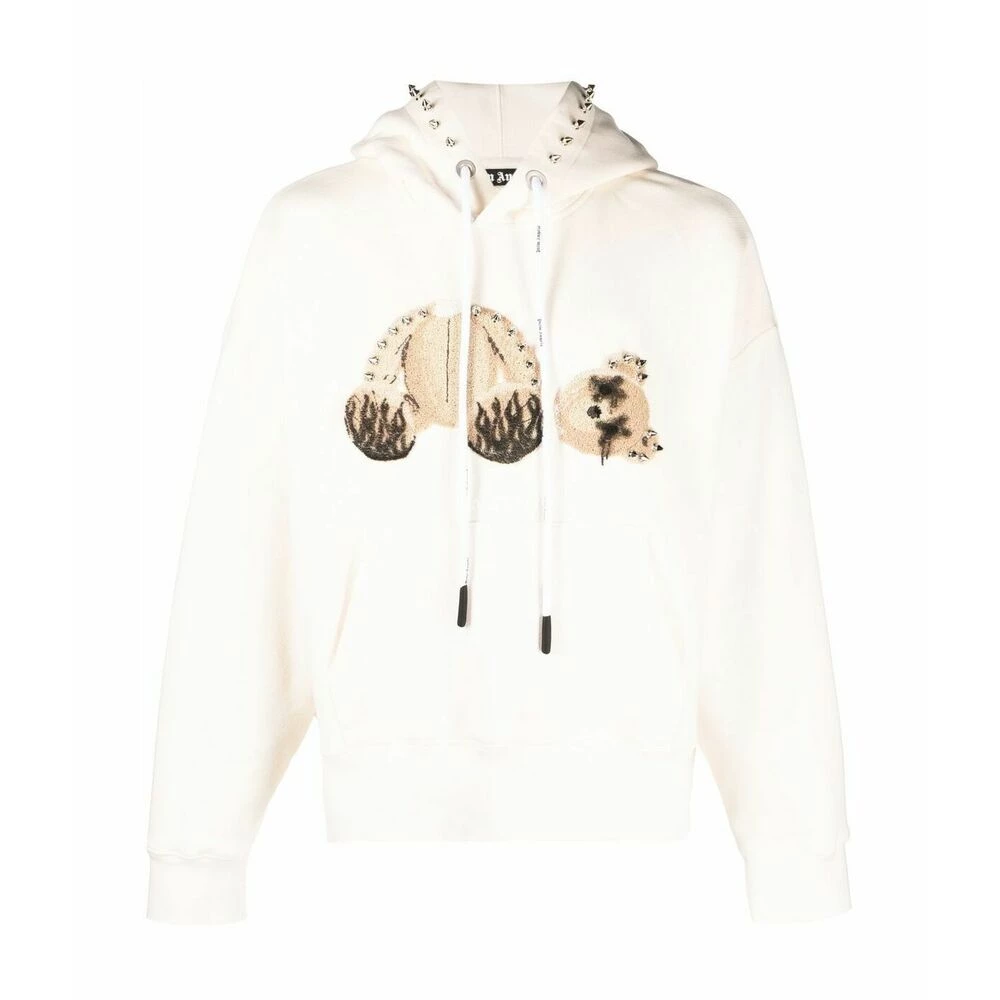 Palm Angels Sweaters White Stud-Embellished DrowString Hoodie fra Palm Angels med kremhvit, bomull, bamseprint, sĂžlvfarget piggpynt, trekkhette, slipp skulder og lange ermer.
