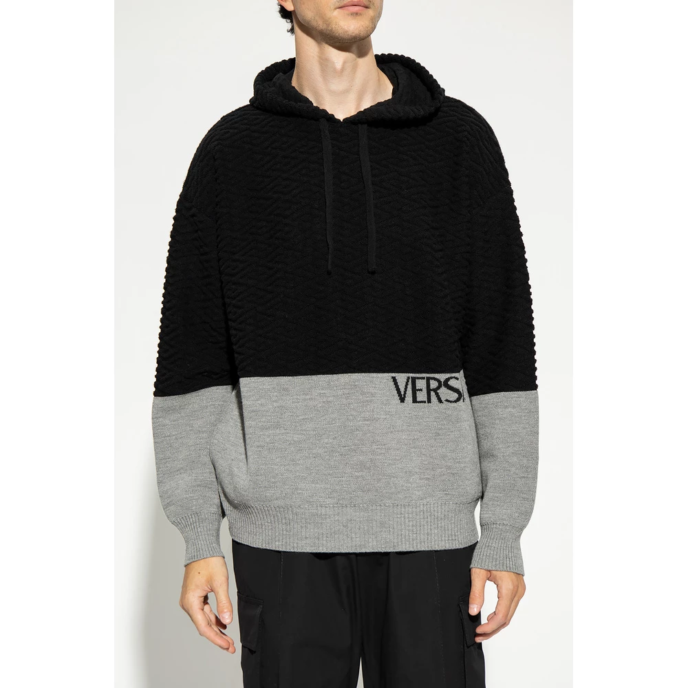 Svart og grÄ genser fra Versace. Denne stilen er laget av ull, og viser merkets LA Greca-mÞnster, logo-broderi, en trekordjusterbar hette, sidelommer og en elastisk bunnhem og mansjetter.