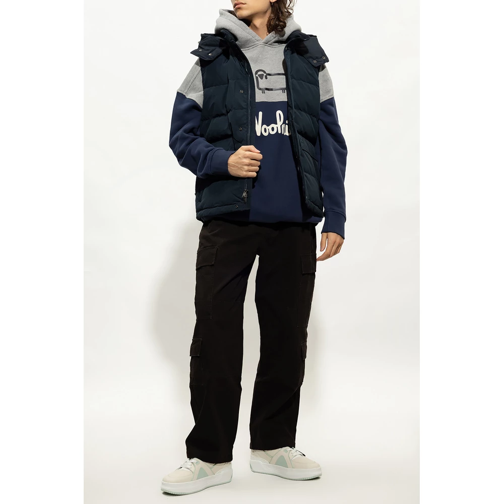 Gray og Navy hettegenser fra Woolrich. Dette plagget er laget av bomull, og har en logotrykk, sidelommer og ribbet kanter.